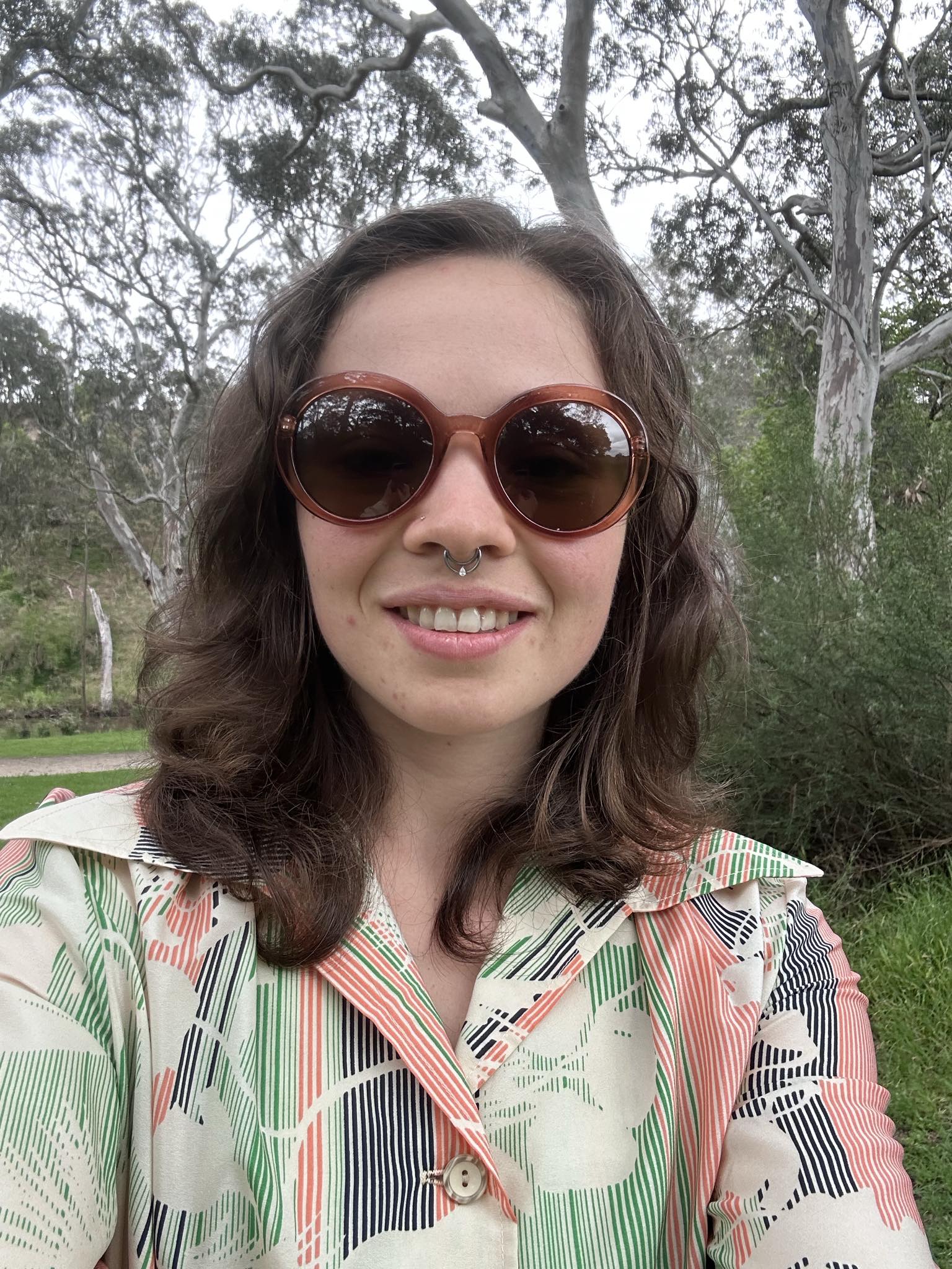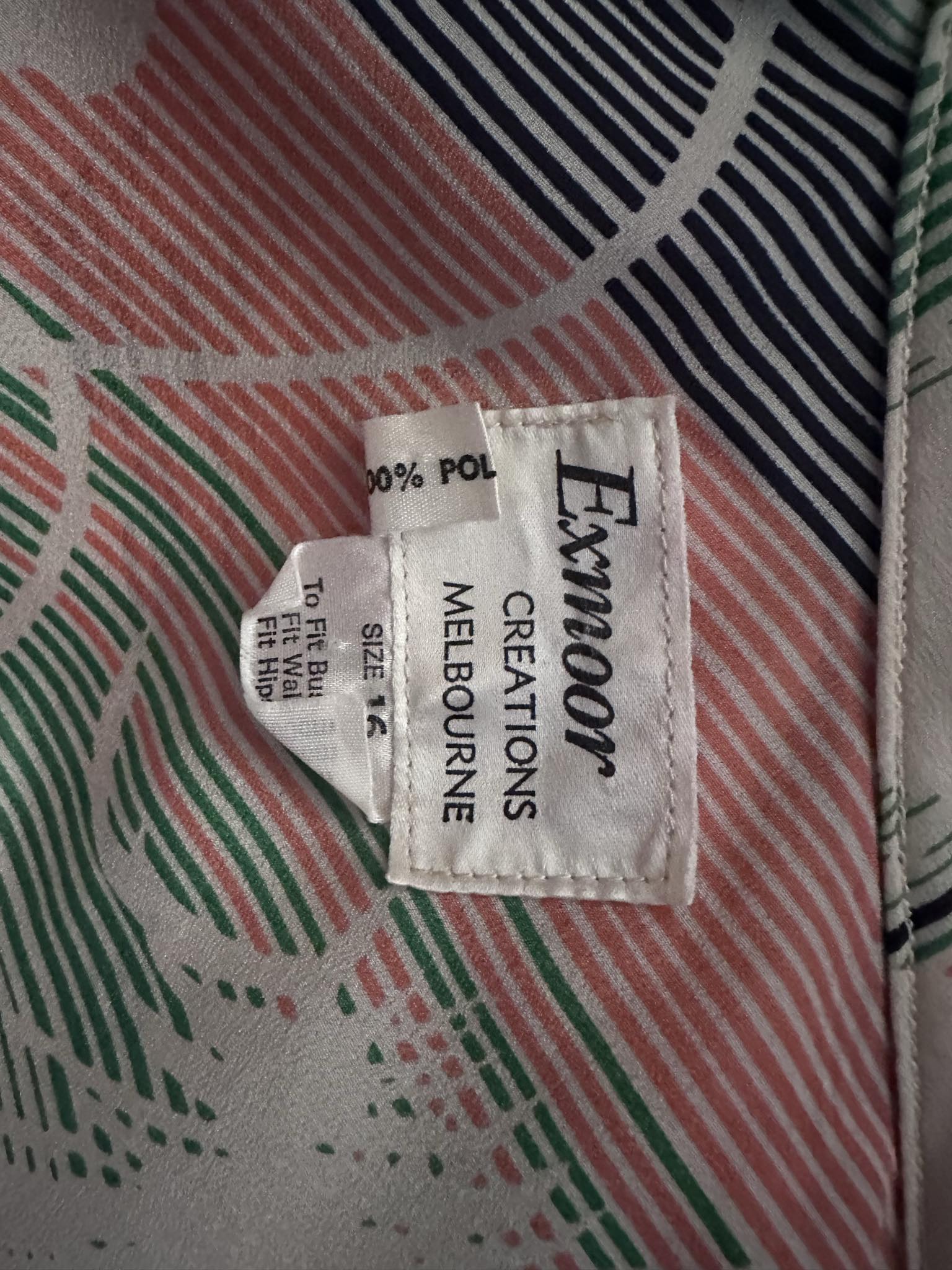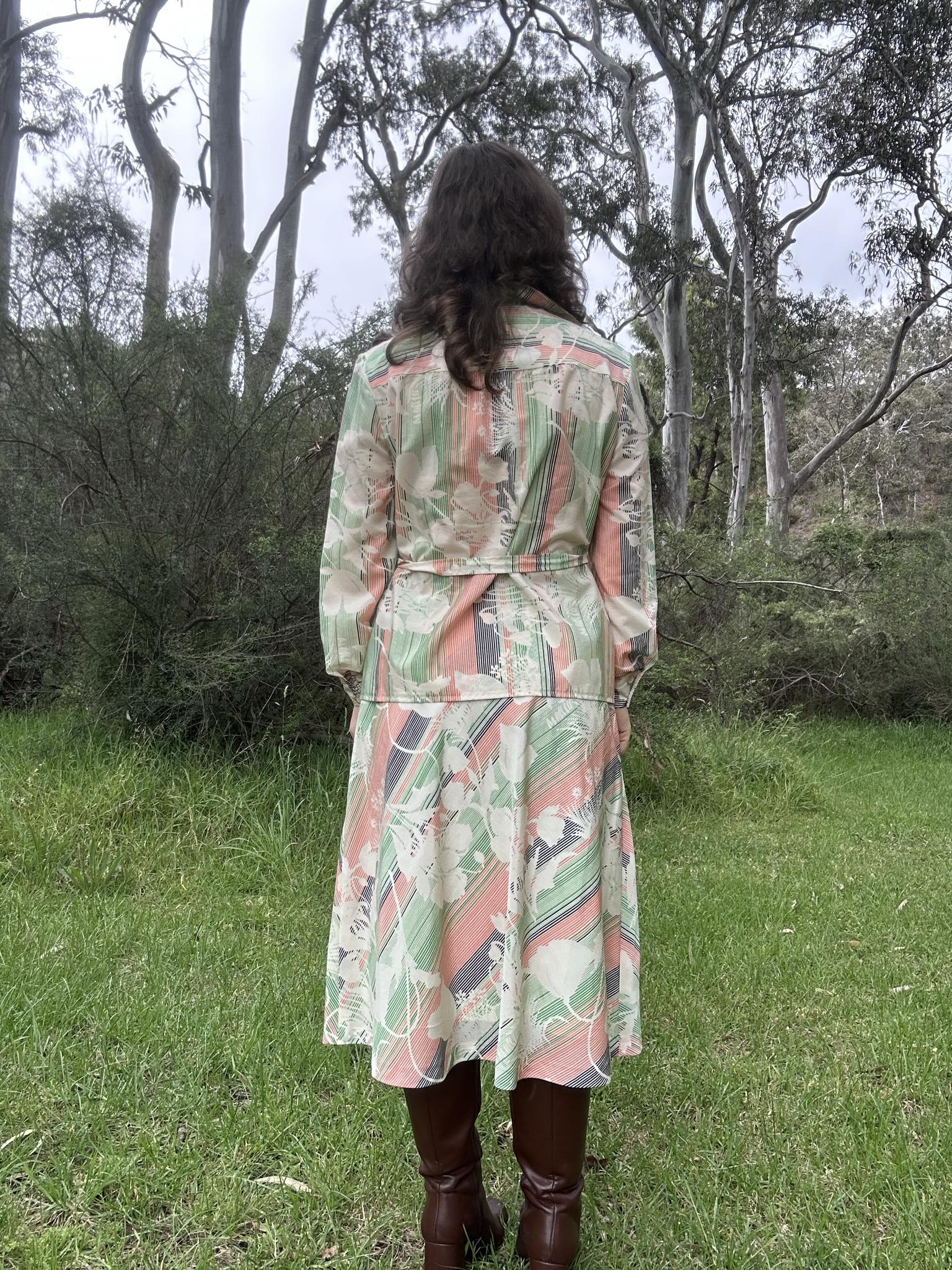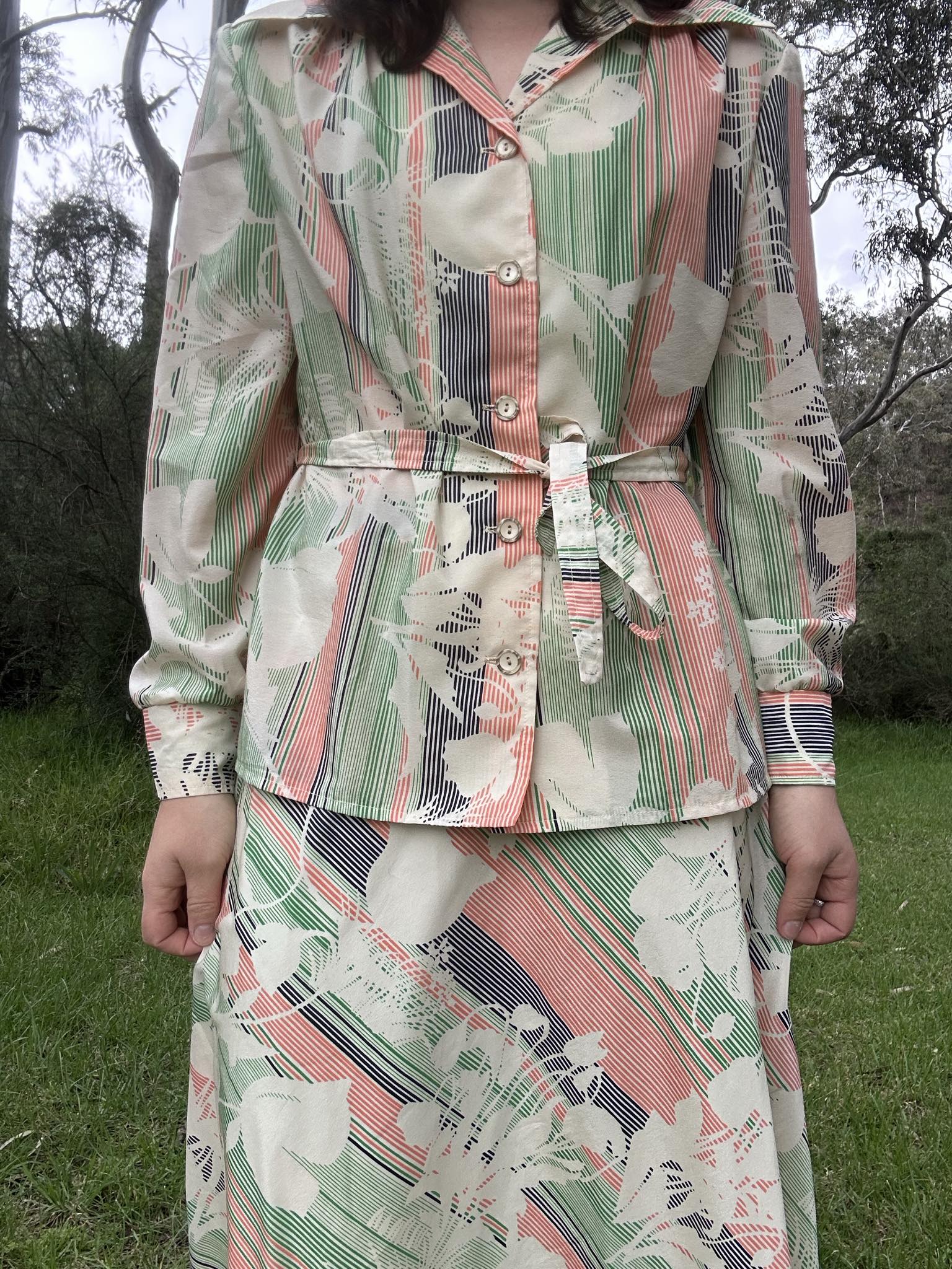 Authentic 1970s two-piece set featuring a coordinated blouse and skirt in striking green, pink, and cream tones. Crafted from 100% polyester, this Melbourne-made vintage piece captures the essence of 70s fashion with its characteristic drape and finish. Originally tagged size 16, it fits closer to a size 12-14, making it ideal for those seeking genuine vintage pieces with character. Perfect for collectors or anyone looking to incorporate authentic retro styling into their wardrobe.