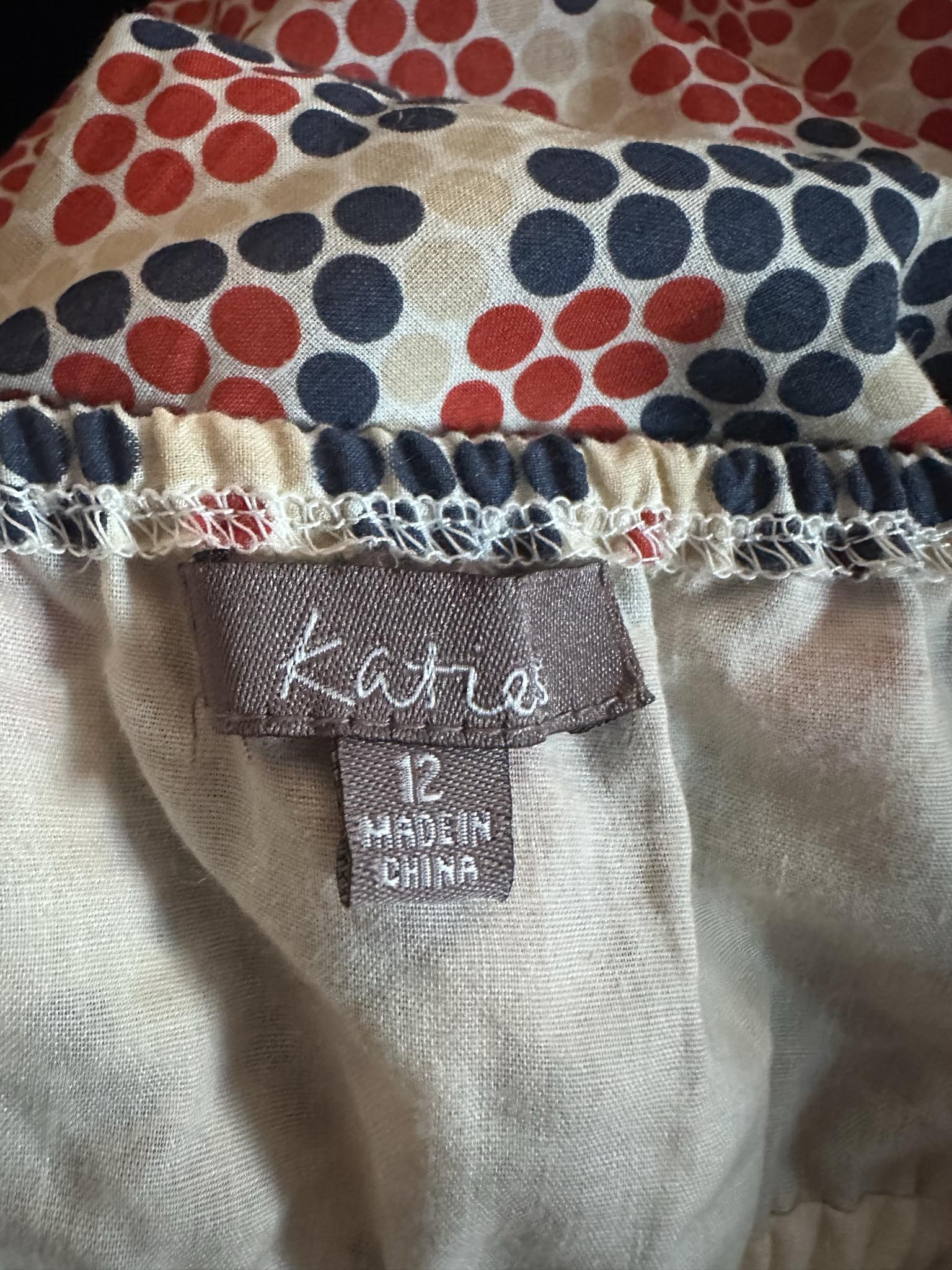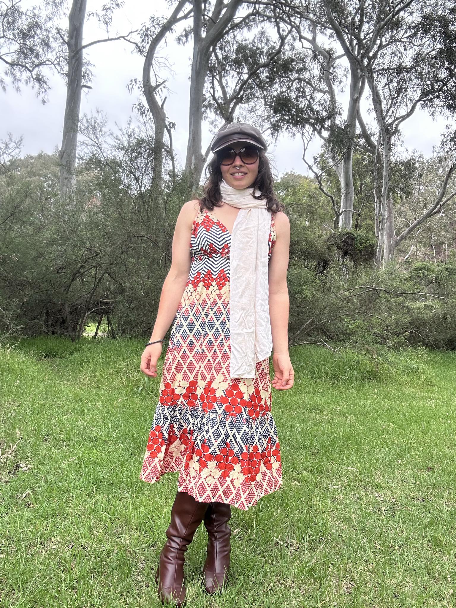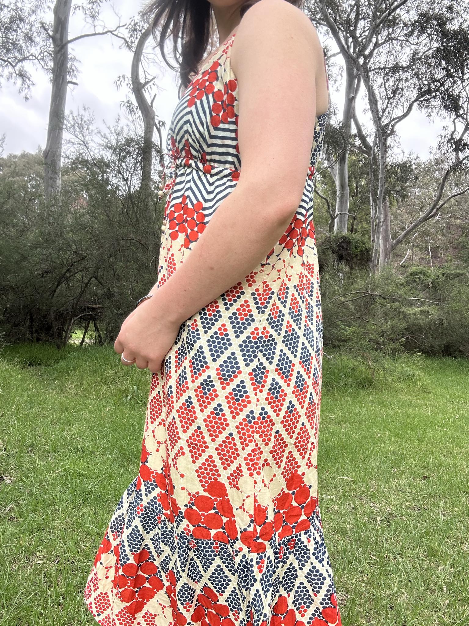 Step into the groovy spirit of the '70s with this bold, funky summer dress that channels retro vibes with contemporary flair. Crafted from a comfortable cotton blend, this statement piece features vibrant reds, blues, and cream tones that capture the essence of vintage summer style. The high drawstring emperor waistline creates a flattering silhouette, while the mid-calf length offers versatile styling options. Perfect for warm weather adventures, this dress delivers authentic retro charm with modern wearability. Katies size 12 (fits closer to AU size 10). A must-have for anyone seeking distinctive, nostalgic fashion with personality.