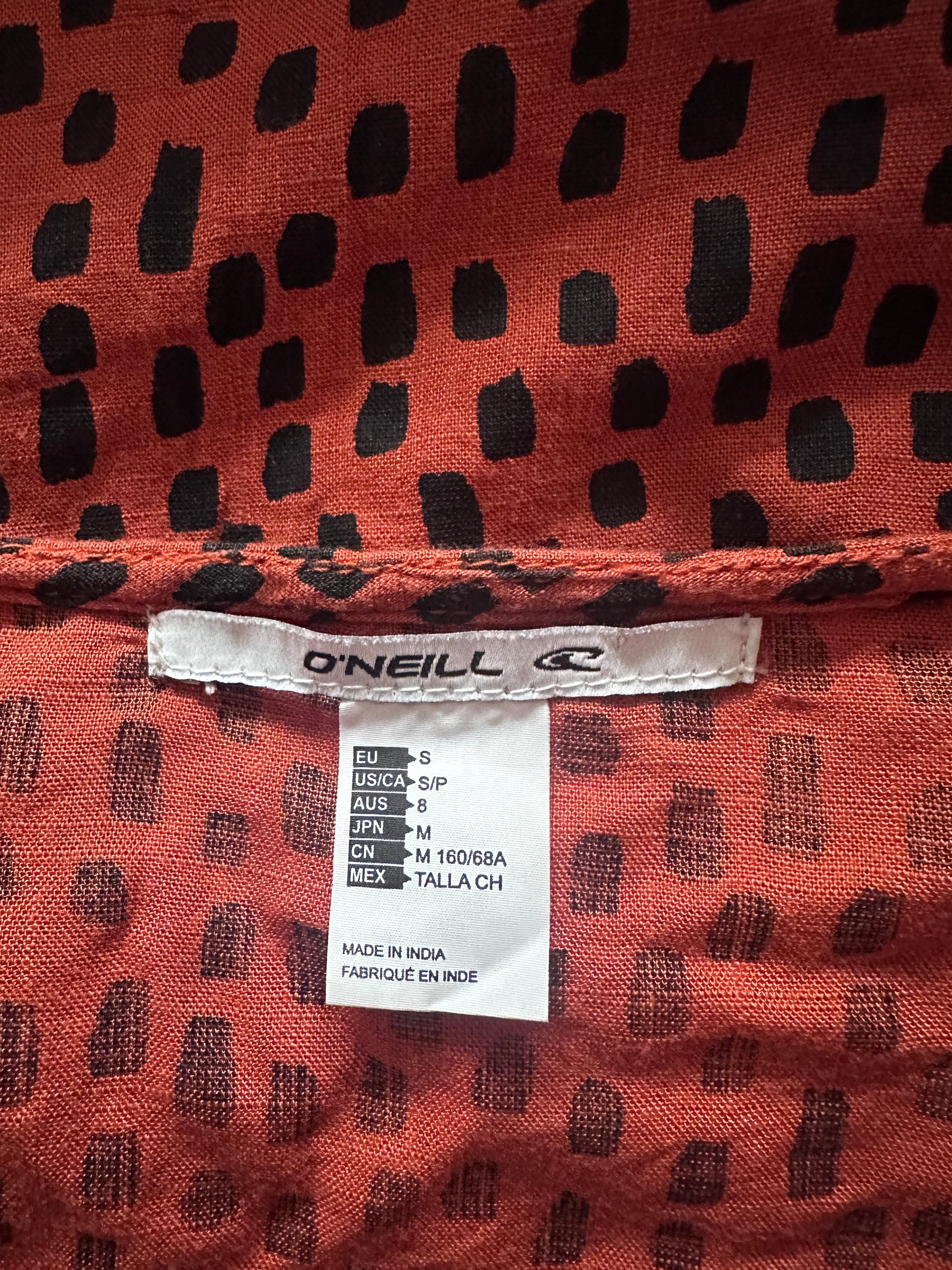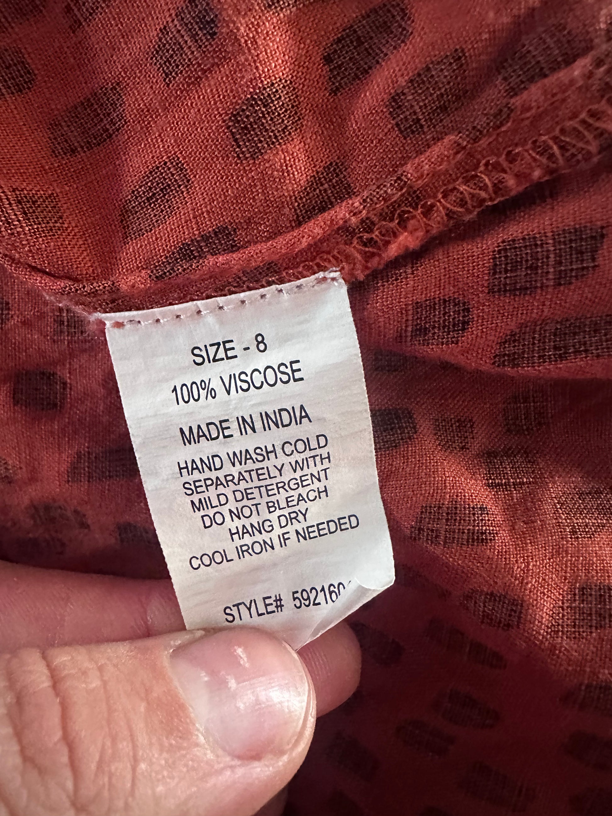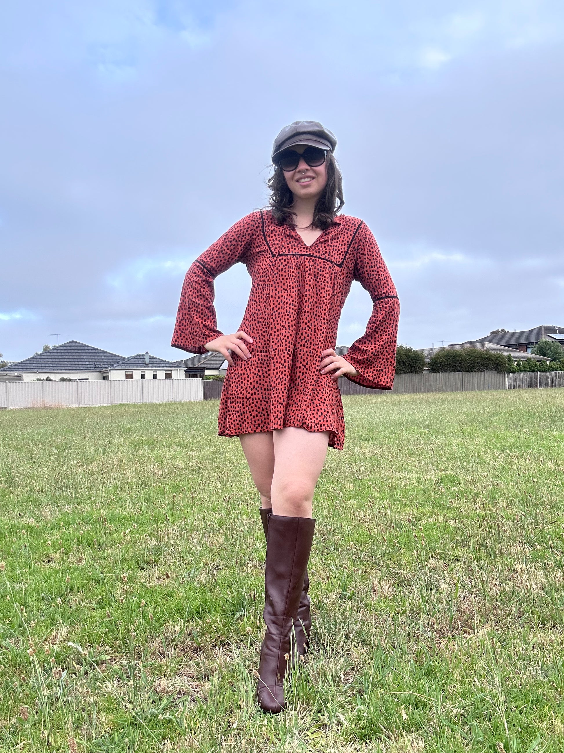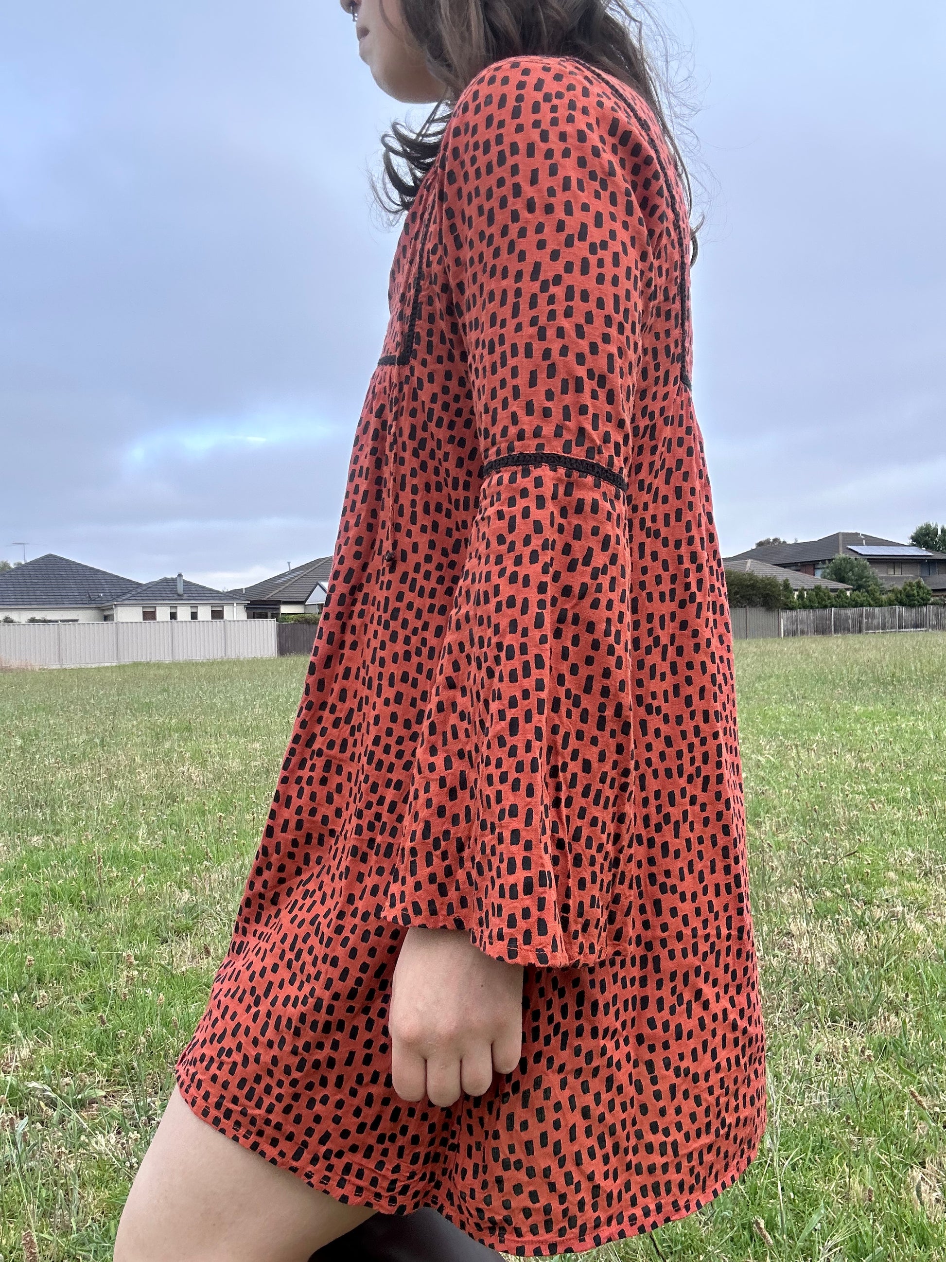 Burnt Orange Bell Sleeve Mini Dress Step into the '70s with this striking mini dress in burnt orange viscose, featuring a bold black rectangle pattern that captures the era's graphic sensibility. The relaxed bell sleeves and mini length deliver authentic vintage appeal, while the fluid 100% viscose fabric drapes beautifully. Made in India, this piece runs true to size 8 but accommodates a size 10—ideal for those with a smaller bust. Style with go-go boots, oversized sunglasses, and a vintage cap for an effortlessly cool retro ensemble.
