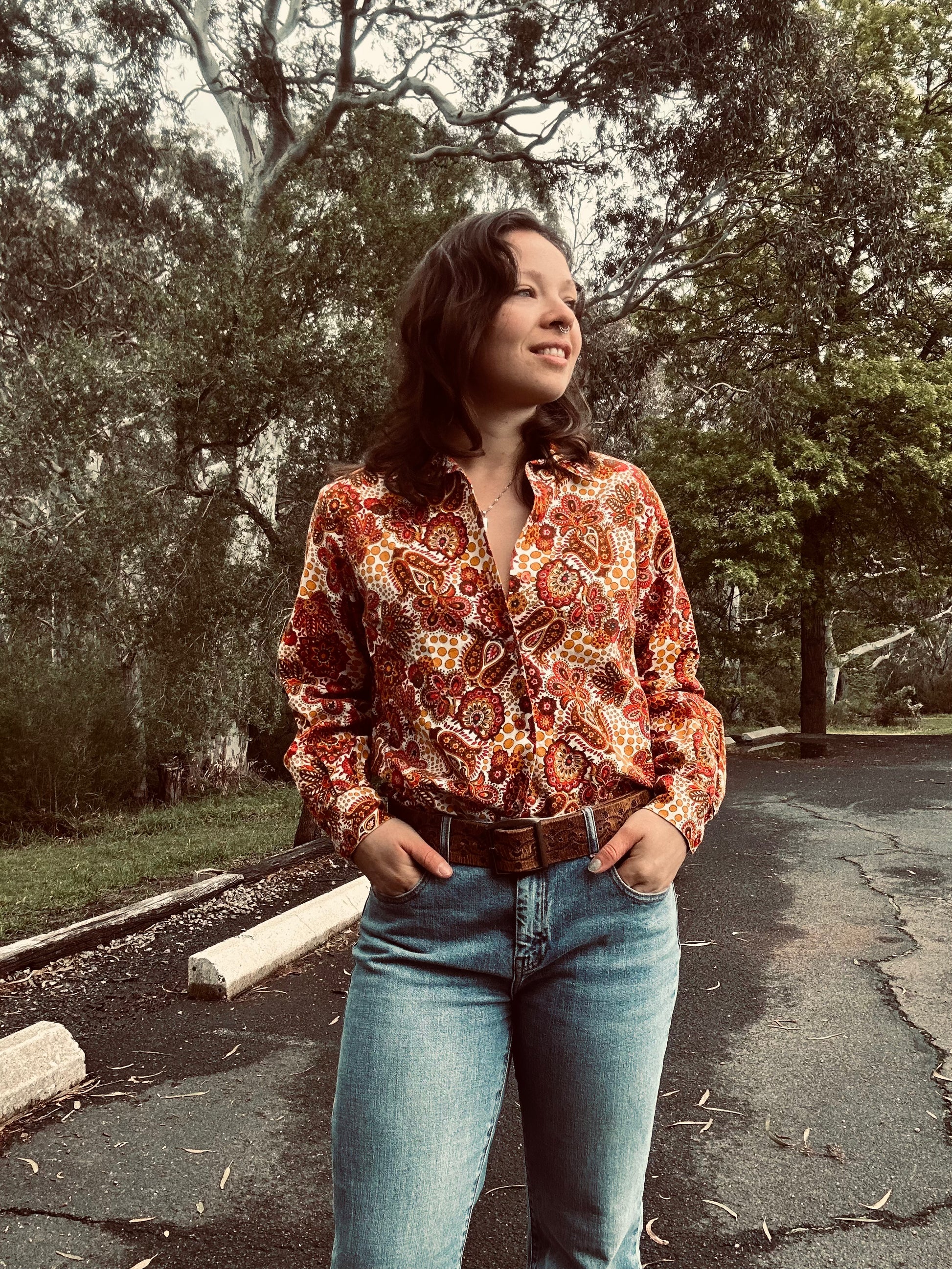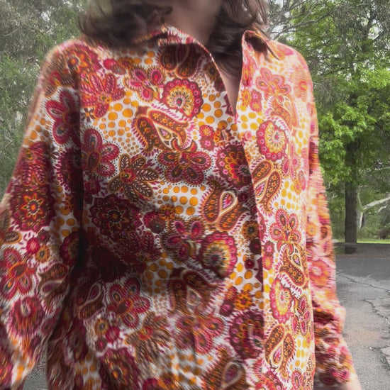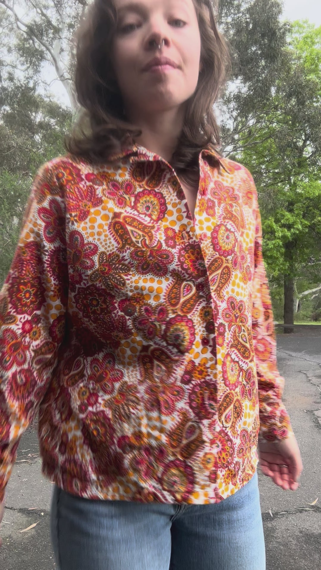 Step back into the groovy 70s with this one-of-a-kind handmade shirt! Crafted from soft, breathable cotton, it features an authentic retro pattern that captures the bold and carefree spirit of the decade. The timeless design pairs perfectly with flare jeans, platform heels, or even a chic blazer for a modern twist.