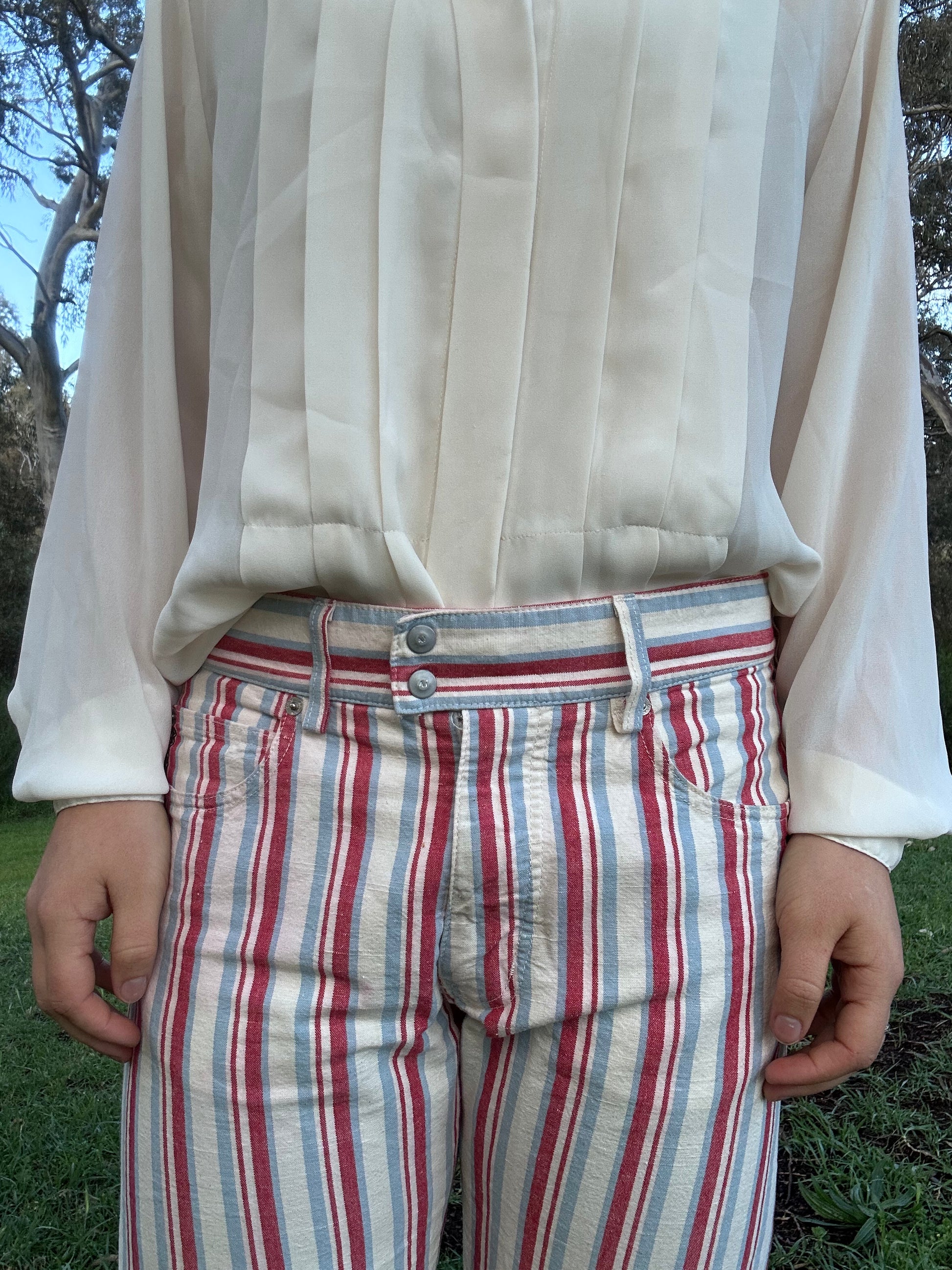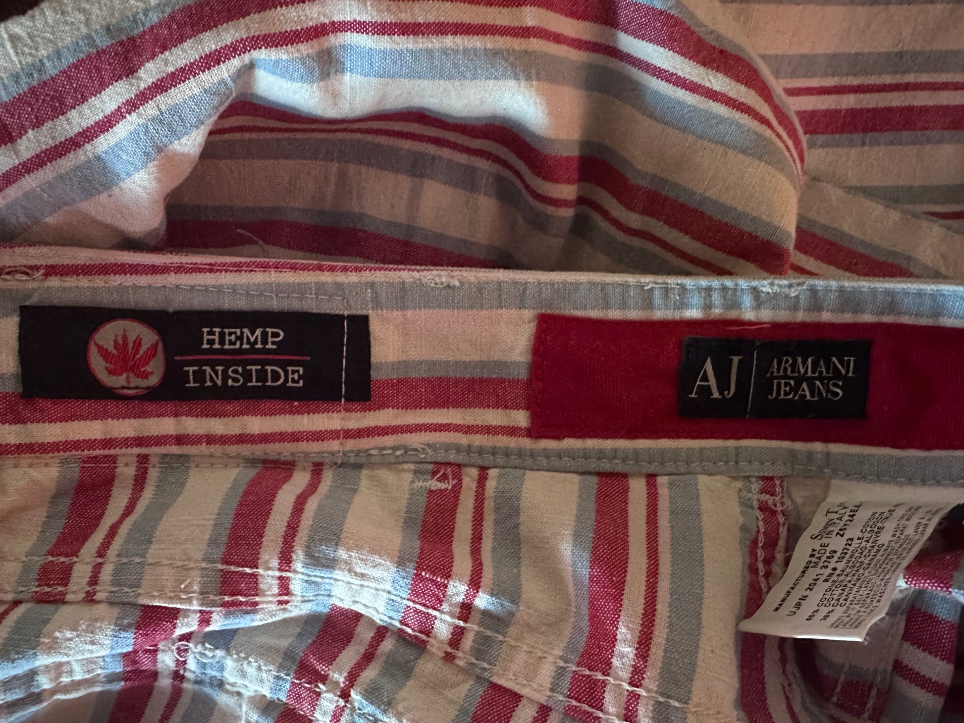 Vintage style Italian striped shirt in red, light blue, and cream featuring a premium cotton and hemp blend. Crafted with quality European construction, this piece offers natural breathability and durability. True to size 10, though it may accommodate a size 12 depending on fit preferences. The classic striped pattern and natural fiber composition make this a versatile wardrobe staple with authentic pre-loved character.