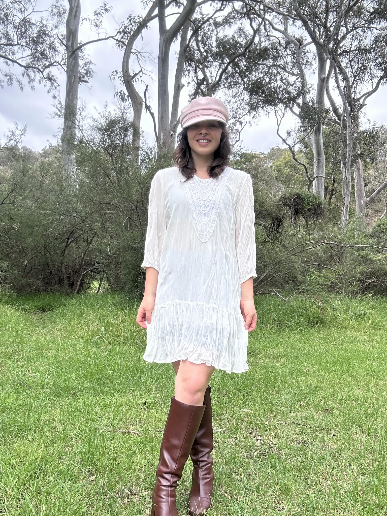 Merric white knee-length dress featuring three-quarter sleeves in a timeless silhouette perfect for vintage-inspired summer styling. Though labelled size 16, this piece fits closer to Australian size 10-12, making it an ideal basic for building effortless 70s-influenced outfits. The clean white palette and classic proportions ensure versatility across seasons, while the modest sleeve length and hemline offer understated elegance. A wardrobe essential for those seeking authentic vintage charm with contemporary wearability.