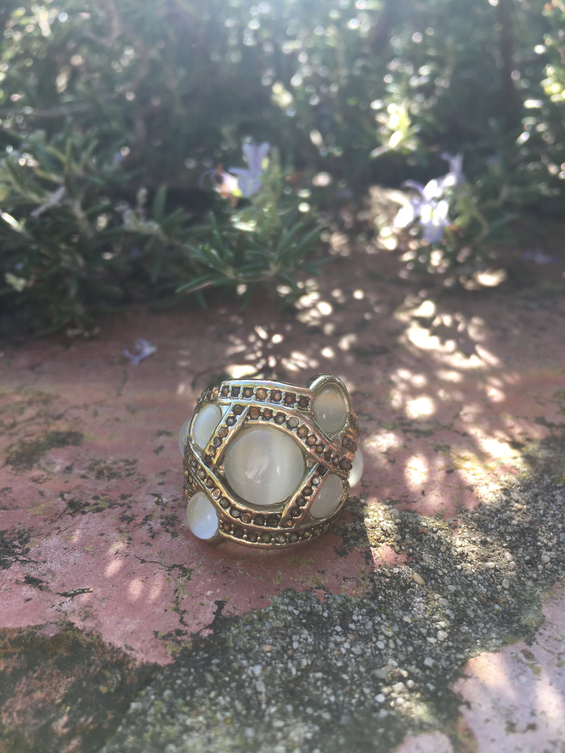 This bold statement ring features glowing moonstone-style gems set in a detailed gold-tone metal band. A mystical piece that catches the light beautifully—perfect for adding a touch of magic to your everyday look!Size L