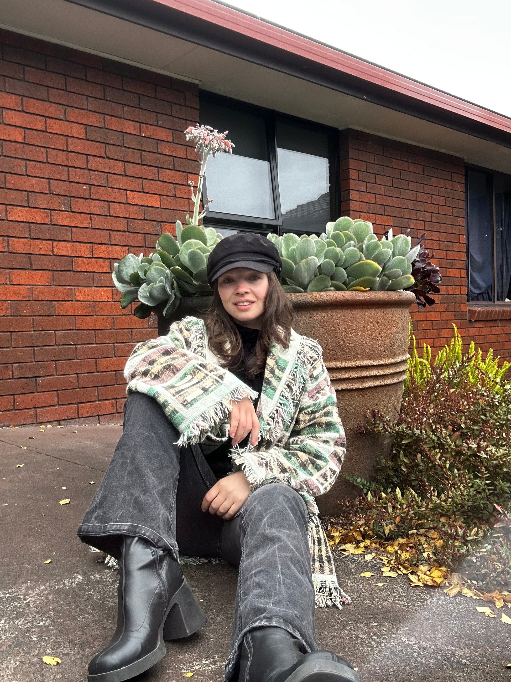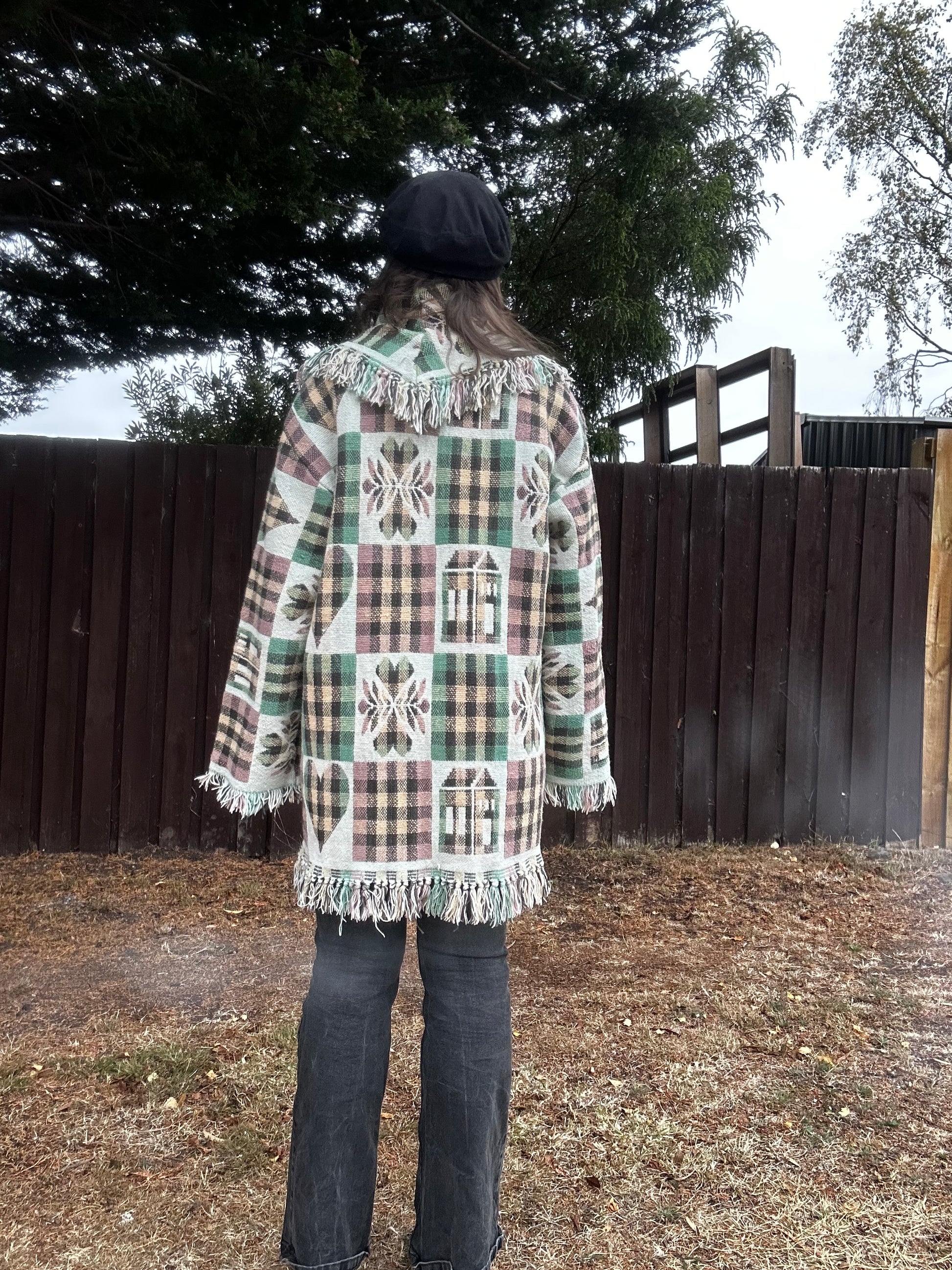 Step right up, fashionistas! Meet the Neutral Vintage Rug Jacket—your new bestie for winter festivals! This quirky masterpiece sports a delightful rug pattern in greens, creams, and browns, complete with playful fringe edges (hello, boho vibes!). Perfect for sizes 10-14, it’s your ticket to warmth and whimsy!