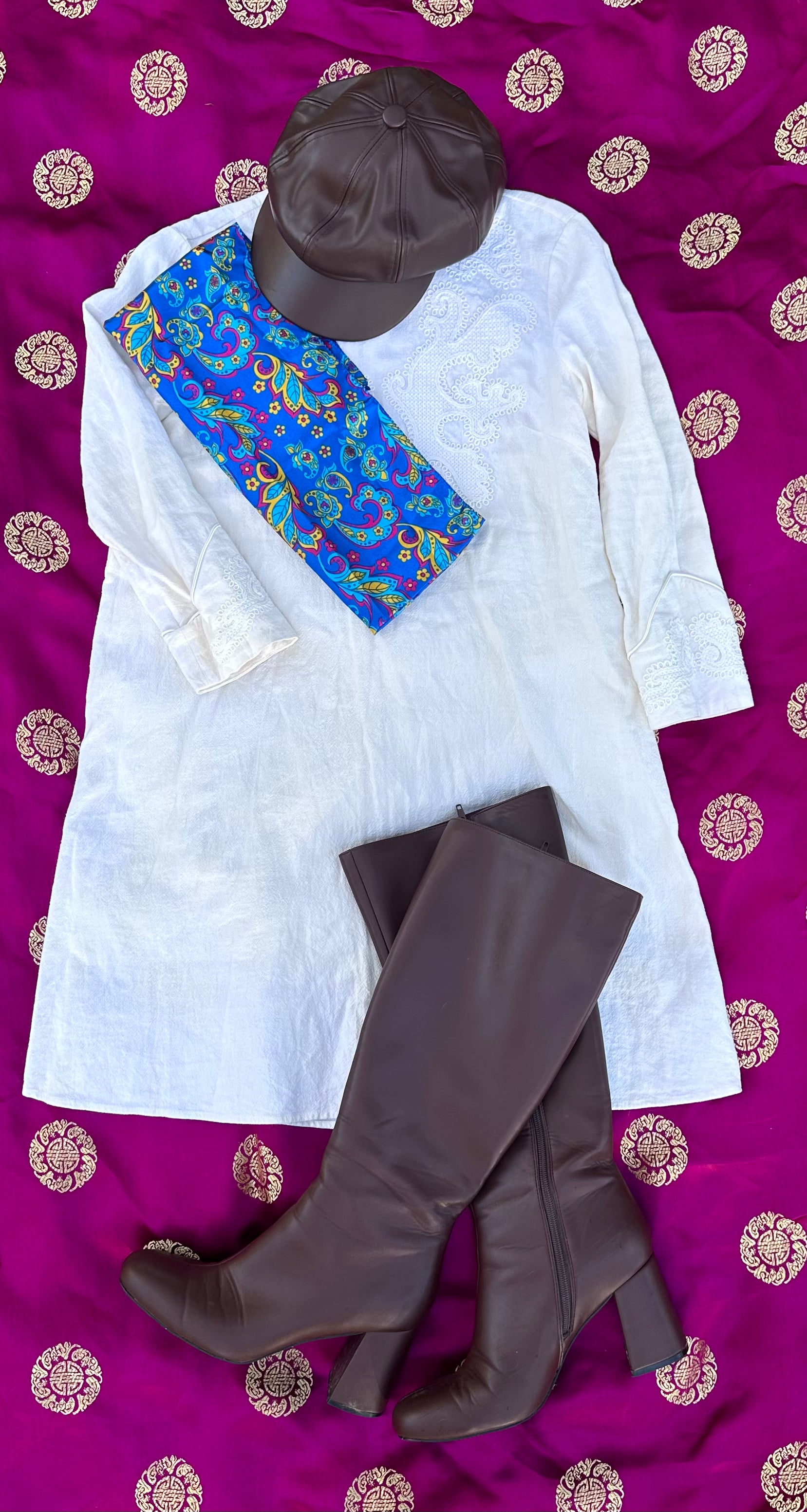 This paisley scarf features a vibrant blue base with swirling psychedelic florals, giving major Beatles “Yellow Submarine”energy. Made from a silky-feel polyester, it has that smooth, lightweight drape without the delicate upkeep of real silk.