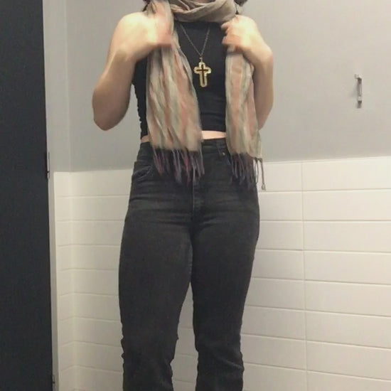 Wrap yourself in character with this beautifully textured secondhand scarf, bursting with personality and warmth. Woven in a medley of soft earth tones—think muted rust, olive, sand, and dusty rose—it brings a rustic, boho touch to any outfit. The light, open weave makes it perfect for layering year-round, while the playful twisted fringe adds a laid-back finish.